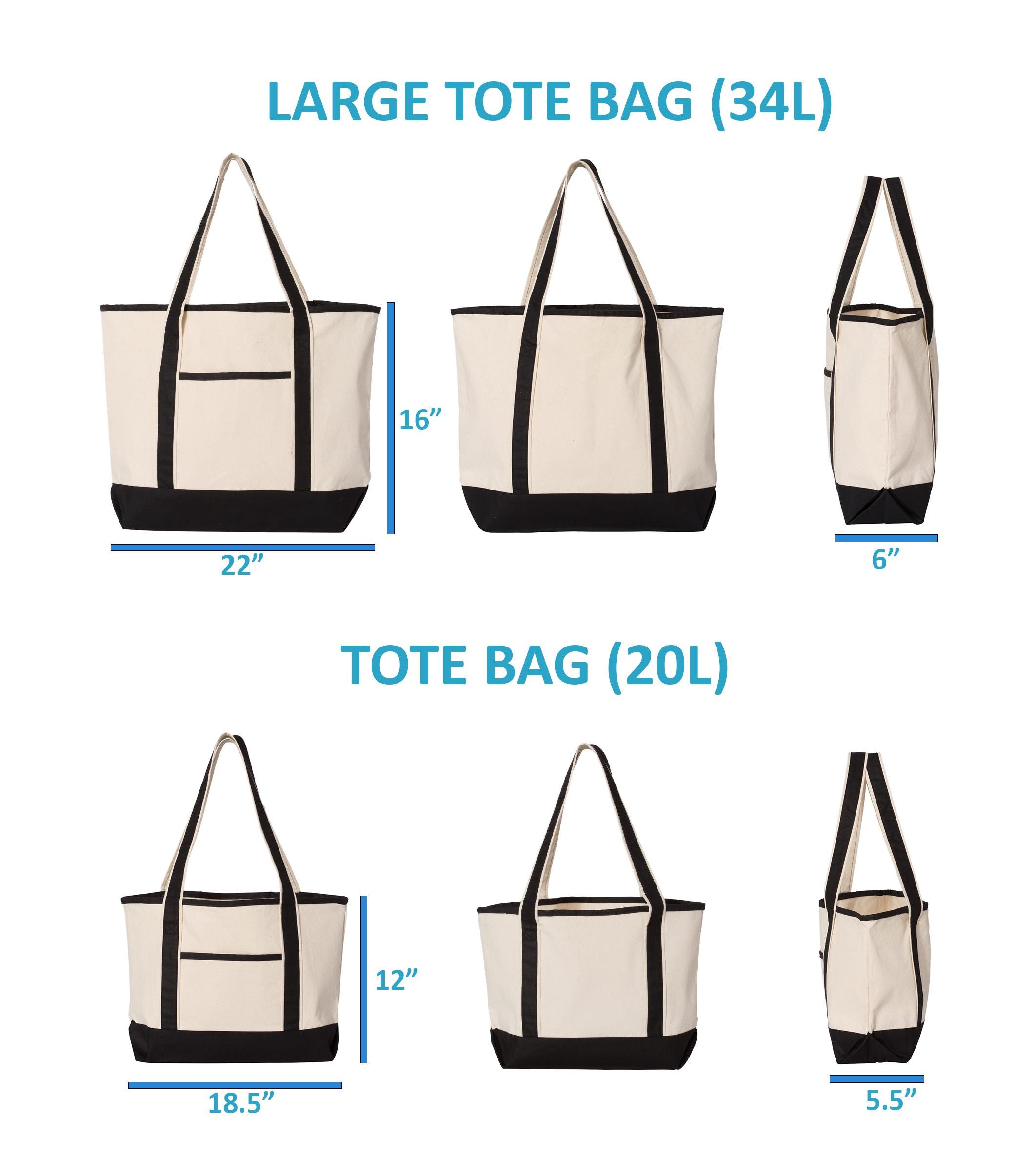 Both sizes: 12 oz., 100% heavy cotton canvas | Inside zippered pocket | Front exterior pocket