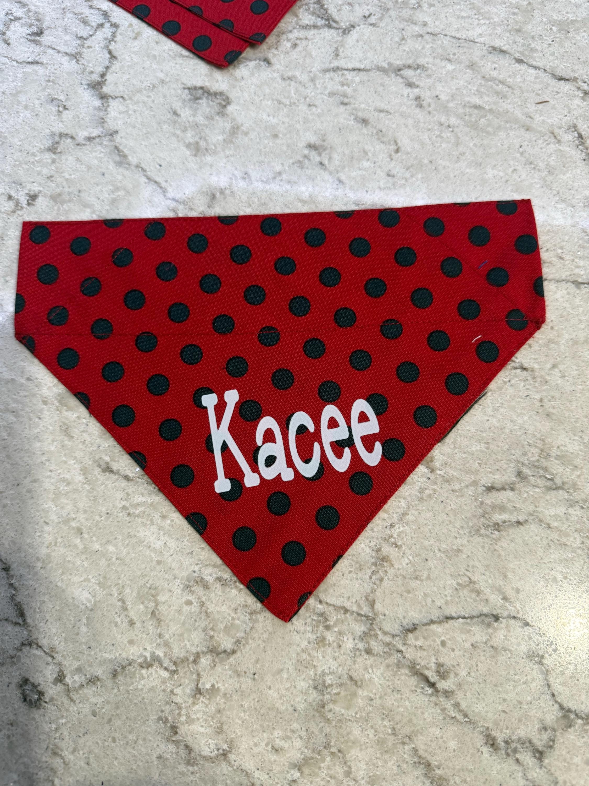 Our Custom Over the Collar Pet Bandana slides on over your pet's existing collar! Add a name, text or Logo to it to make it more fun! Choose from our huge list of fabric and you can also pick from our list of Font Colors to stand out from the pack! We use Professional Heat Transfer Vinyl for the Name. Dog Collar and Dog Tag are NOT included.