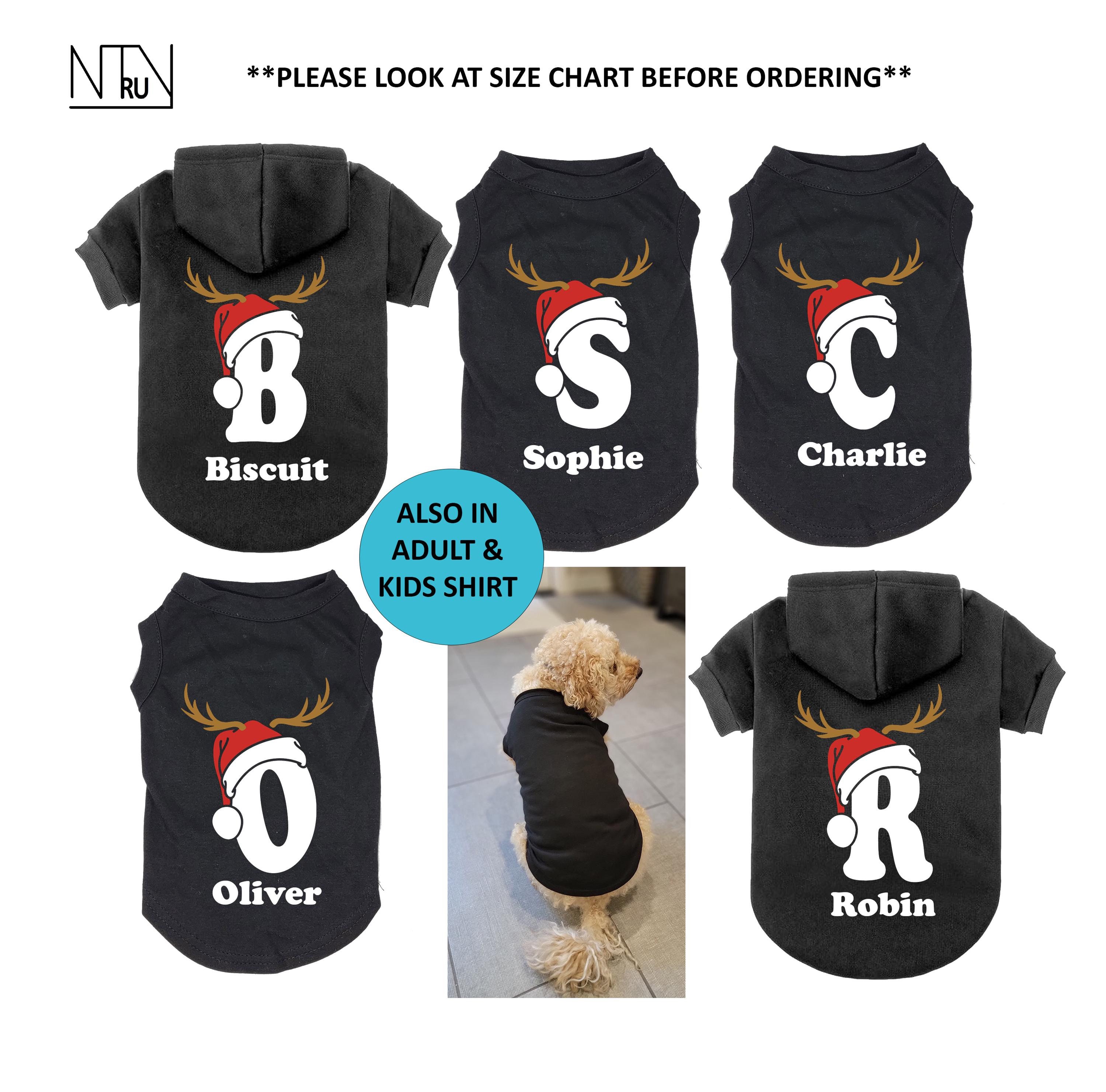 Our Christmas Dog shirt and Dog Sweater Hoodie Collection is here! This design features a large letter initial of your dog's name with a fun and playful Santa Hat with Reindeer Antlers to bring the Christmas joy! Unleash Your Creativity this Christmas Holiday Season with Our Custom Dog Tees and Sweaters! Our design is also available on Adult Unisex T-Shirts, Youth and Toddler T-Shirts, Baby Onesie Bodysuits so you can include the entire family with Family Christmas Shirts. Now your dog and cats can join in on the family matching shirt and not feel left out with these Christmas Group shirts.