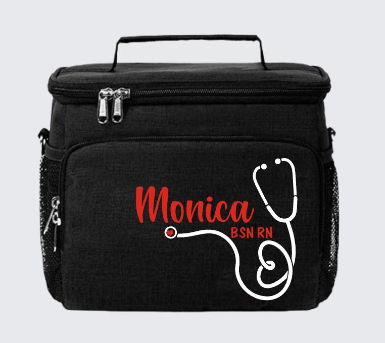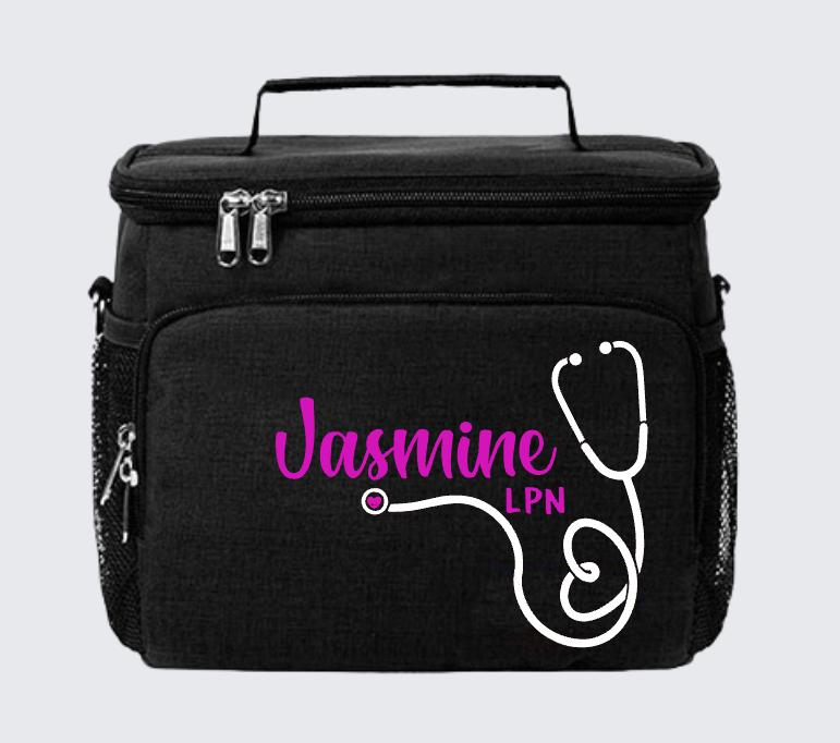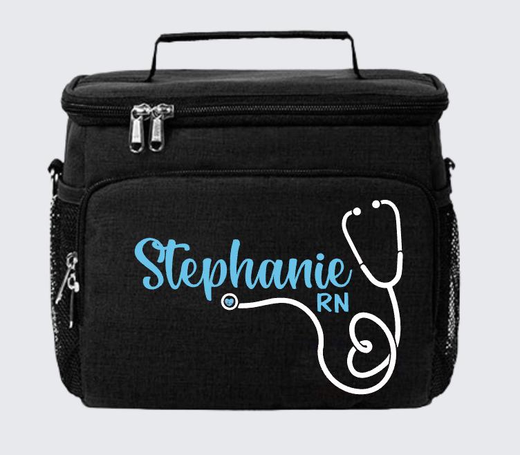 Personalized nurse lunch bag with your name in elegant script and stethoscope line art. Insulated cooler holds 9 cans plus ice. Printed in Santa Ana, CA.
